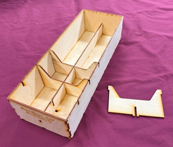 Card Tray 2.25" X 3.25" X0.375" 5 Deck, Kit, (57mm X 82mm)A tray kit for 5 decks of cards with spaces that are 2.25" X 3.25" by 0.375" (9.5mm) tall. Assembly required, recommended tools to assemble the trays; hobby knife, sand paper and glue. The Kit card trays were an early design, there is a newer Flat Pack